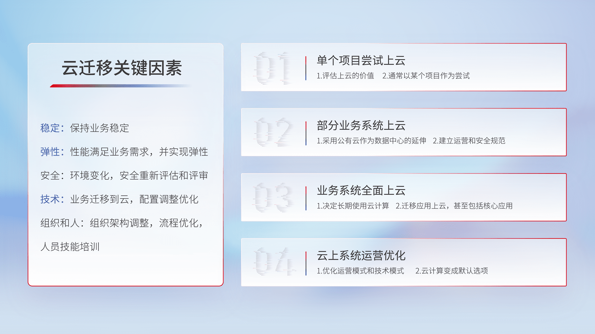 结合实际业务,,,从规划设计、、云平台选型、、云原生改造、、数据迁移、、、、集成交付,,,迁移全过程为客户识别最佳上云路径,,,,做好风险识别管理,,设计网络架构、、、、身份权限、、、、安全审计合规、、操作审计、、、日志审计、、监控告警策略、、、、多站点容灾设计等,,,对云上基础设施进行整体规划,,提升IT治理水平,,以满足弹性、、高可用、、、高性能的需求。。。。