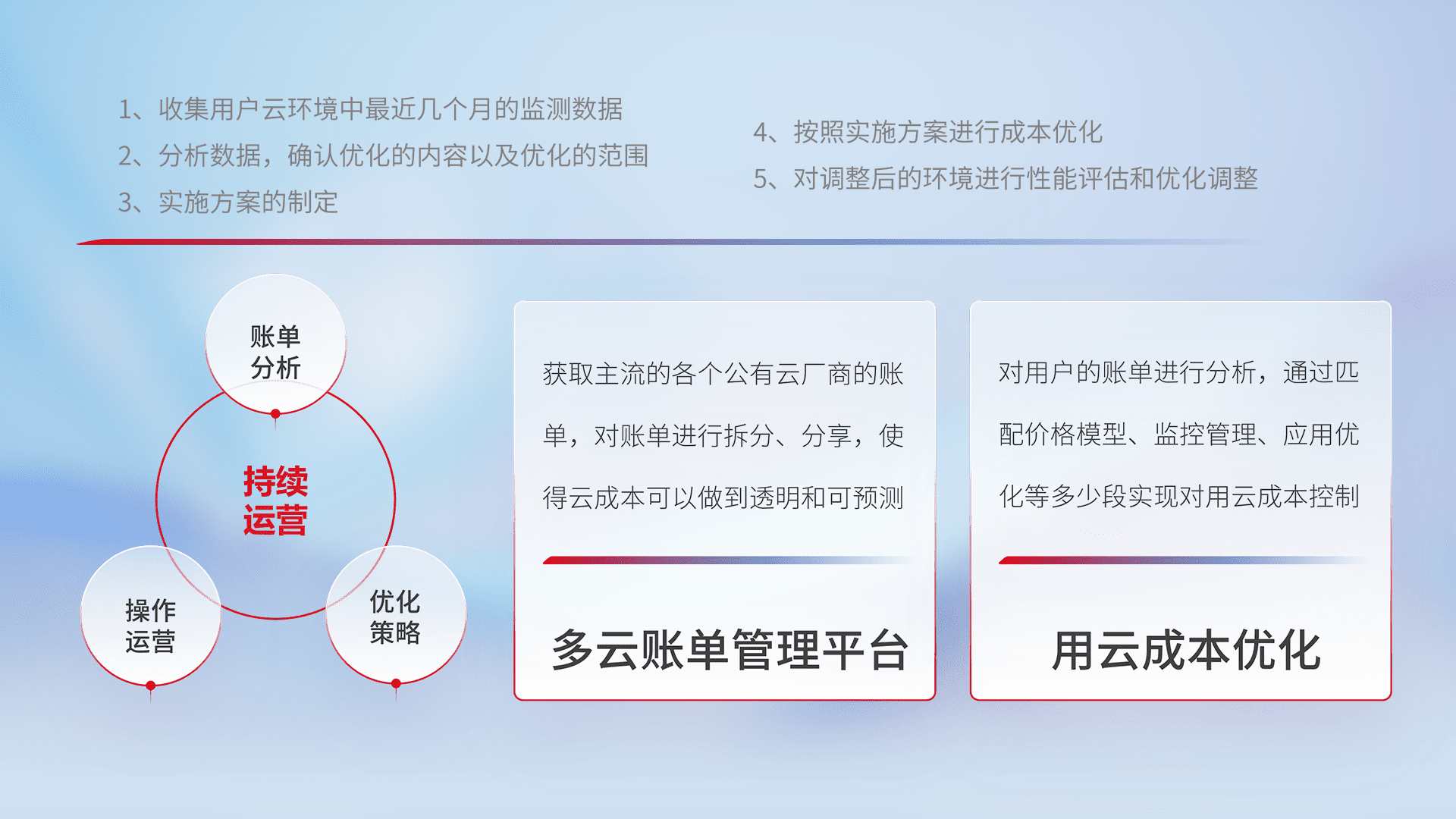 通过多云纳管,,,,以统一的资源数据模型把客户的云资源进行抽象和封装,,,,进而实现对多云资源的统一操作,,,,保障云资源管理的可靠性、、、稳定性与可用性。。。量身定制化运维内容,,配置、、、、开发运维、、、补丁管理、、、备份、、监控、、、认证和访问管理、、审计和日常巡检等,,,保障在用云过程中的可靠度,,稳定度以及高可用率。。